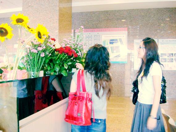 他住新光醫院,我們先在樓下幫他選花